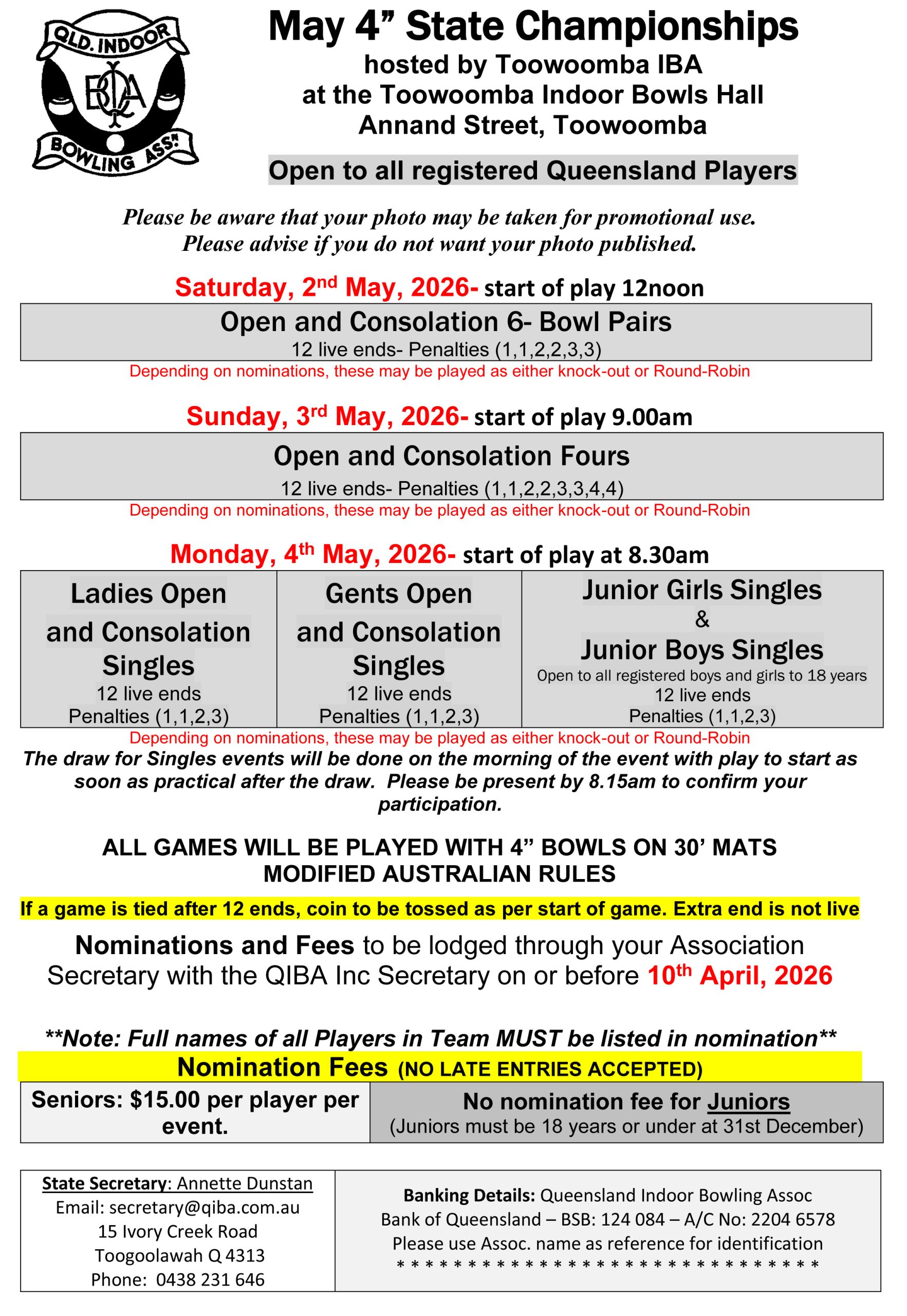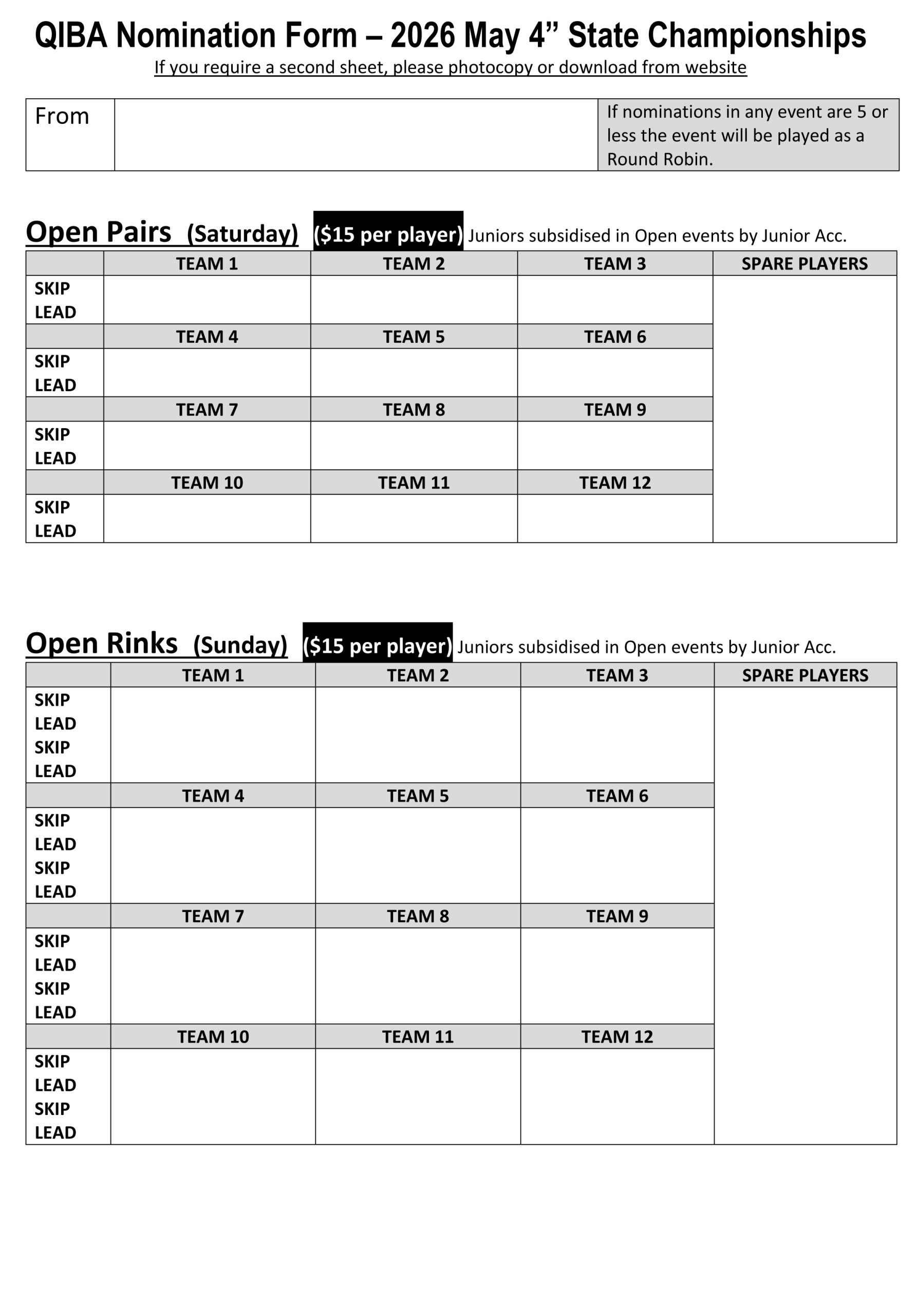 Saturday 2nd May 2026 – Open and Consolation 6 Bowls Pairs